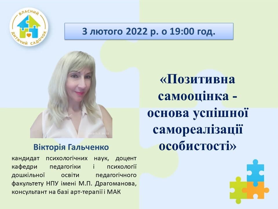 Гальченко Вікторія Миколаївна, кандидат психологічних наук, доцент кафедри педагогіки і психології дошкільної освіти педагогічного факультету НПУ імені М.П. Драгоманова, консультант на базі арт-терапії і МАК.