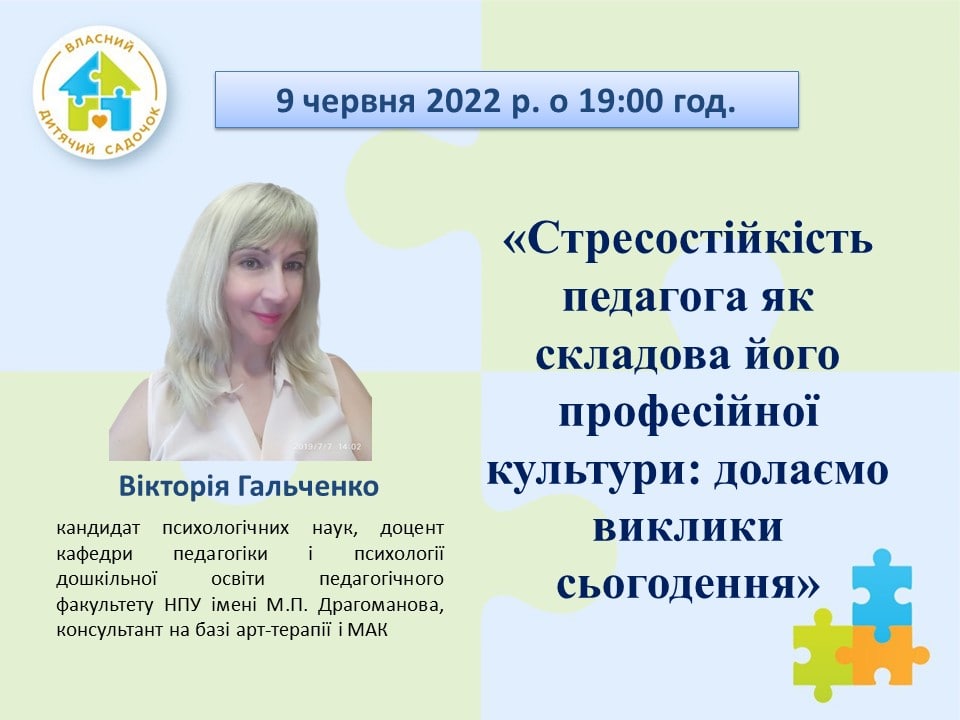 Гальченко Вікторія Миколаївна, кандидат психологічних наук, доцент кафедри педагогіки і психології дошкільної освіти педагогічного факультету НПУ імені М.П. Драгоманова, консультант на базі арт-терапії і МАК.