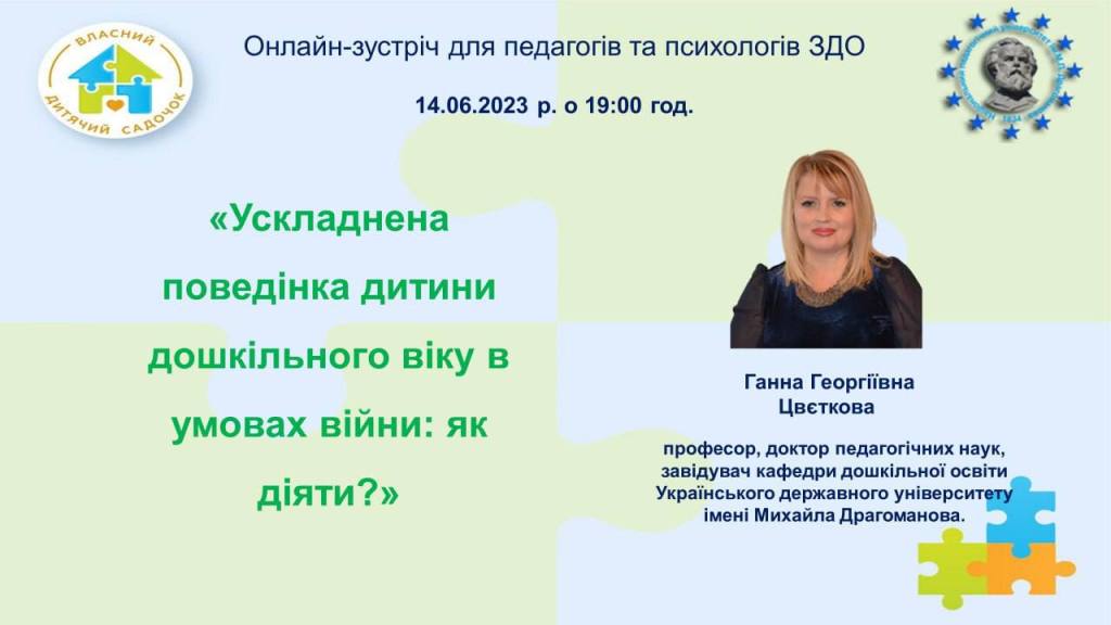 Спікер: Цвєткова Ганна Георгіївна, професор, доктор педагогічних наук, завідувач кафедри дошкільної освіти Українського державного університету імені Михайла Драгоманова.